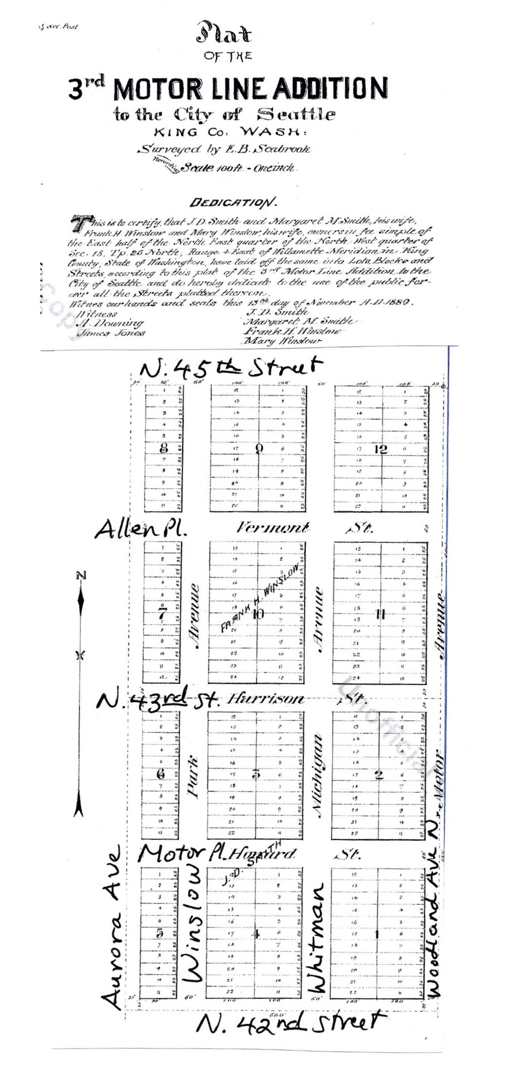A plat for a section of land from North 42nd to 45th Streets in Fremont was filed in November 1889 and named Third Motorline Addition. The property owners were two couples, Frank Harvey Winslow & his wife Mary, and John D. Smith & his wife Margaret. The two families may have become acquainted as neighbors, as both lived on West Garfield Street on Seattle’s Queen Anne Hill.